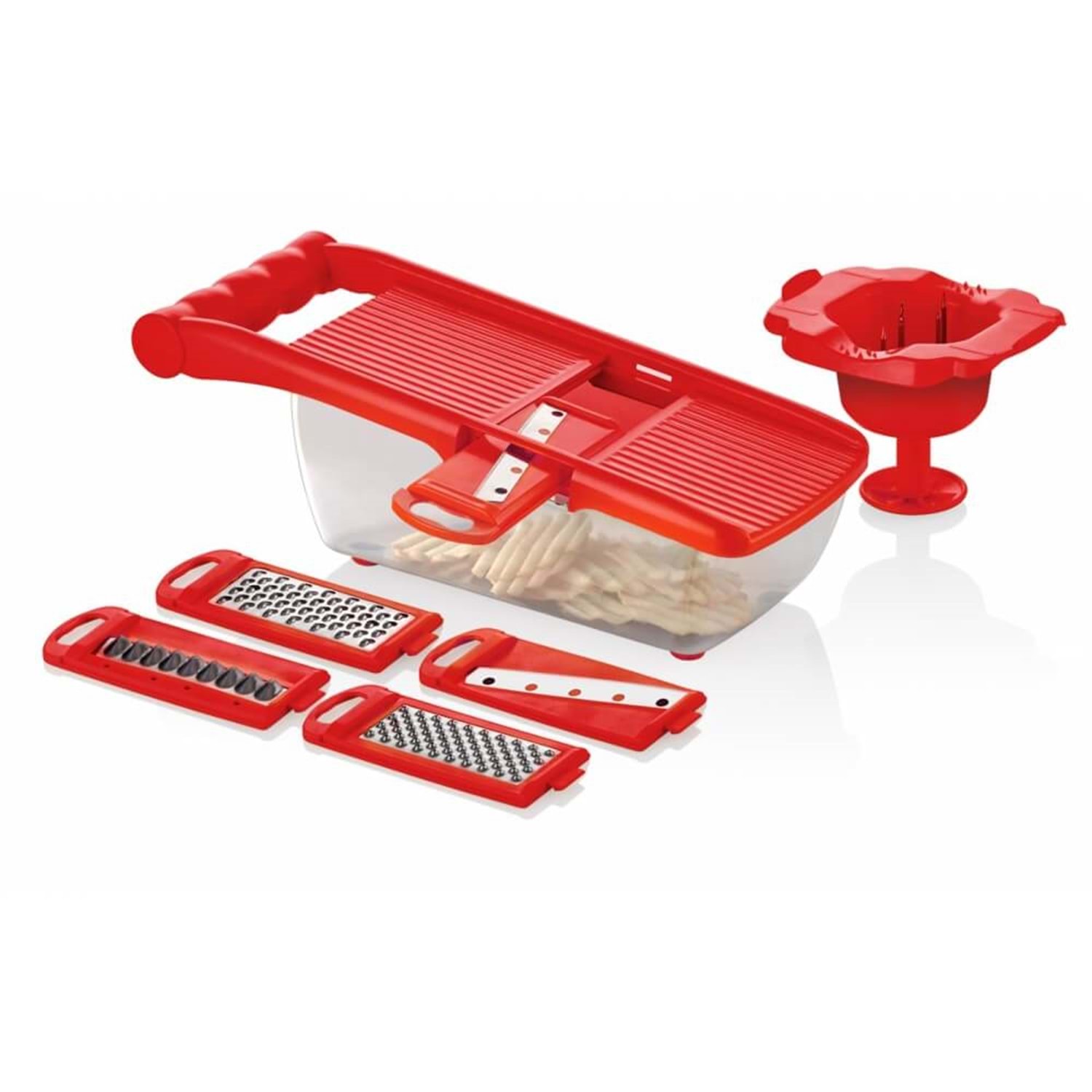 URVE ŞARJÖRLÜ RENDE Sebze ve meyveleri eşit miktarlarda dilimlemek için yıllardır mutfaklarda en büyük yardımcılarımızdan biri rendelerdir. Mutfaklarımızda yemek yaparken yemeklere uygun olarak ürünlerimizi doğramamız, parçalamamamız gerekmektedir. İşte bu farklı ihtiyaçlarınızı bir arada gidermeniz için tasarlanmış olan Wenken Şarjörlü Rende, içeriğinde farklı boyutlarda kesme, dilimleme ve parçalama işlemi yapmanıza yardımcı aparatlara ve bıçaklara sahiptir. Kullanımı kolay Yer kaplamaz Paslanmaz çelik bıçak Kaymaz Taban Yerli üretim BPA İçermez, gıda ile temasa uygundur